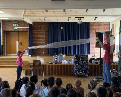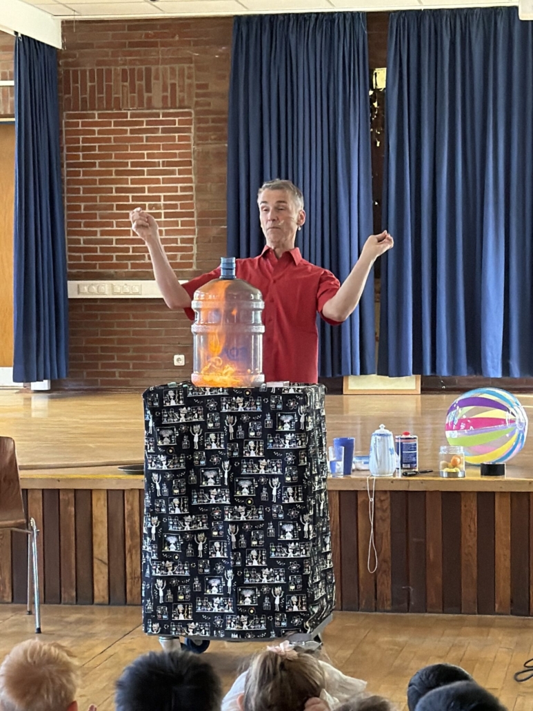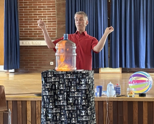 Dabei ging es auch schon einmal heiß her, um zu zeigen, wie ein Motor eigentlich Antriebsenergie erzeugt und was Sauerstoff damit zu tun hat. Mit einem handelsüblichen Staubsauger wurden Energiebälle abgeschossen und ein Heißluftballon per Laubbläser zum Ziel bugsiert, um zu zeigen, wie ein Luftstrom sich verhält. Auch die tollpatschige Teekanne konnte vor dem Zerspringen bewahrt werden. Unsere Kinder durften tatkräftig mithelfen, damit jedes Experiment auch gelingen konnte. So schafften Sie es, eine ganze Luftsäule in einen Folienschlauch zu pusten, ohne vorher eine Superlunge einbauen zu lassen. Das machte den Kindern viel Spaß und sorgte (selbst bei den Ältesten) für viel „Oooh“ und „Aaa“. Wir haben uns sehr gefreut, dass wir alle gemeinsam dieses Highlight für die Kinder ermöglichen konnten.